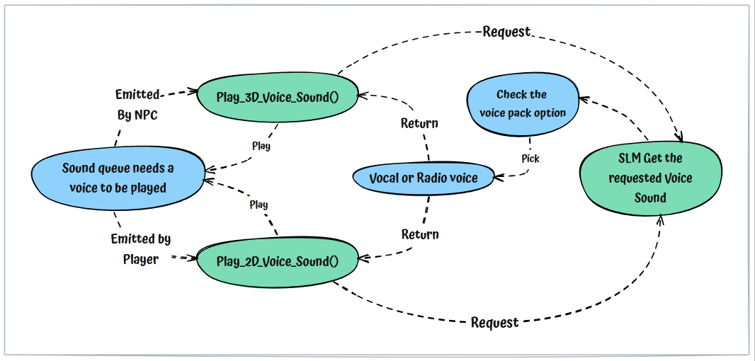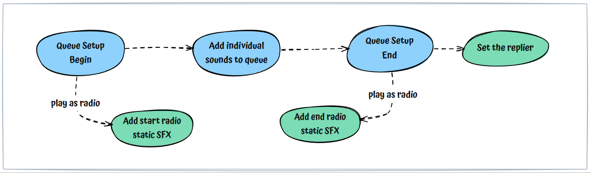 The voice queue system also incorporates a logic handler for managing radio command, reply, and report interactions between characters.