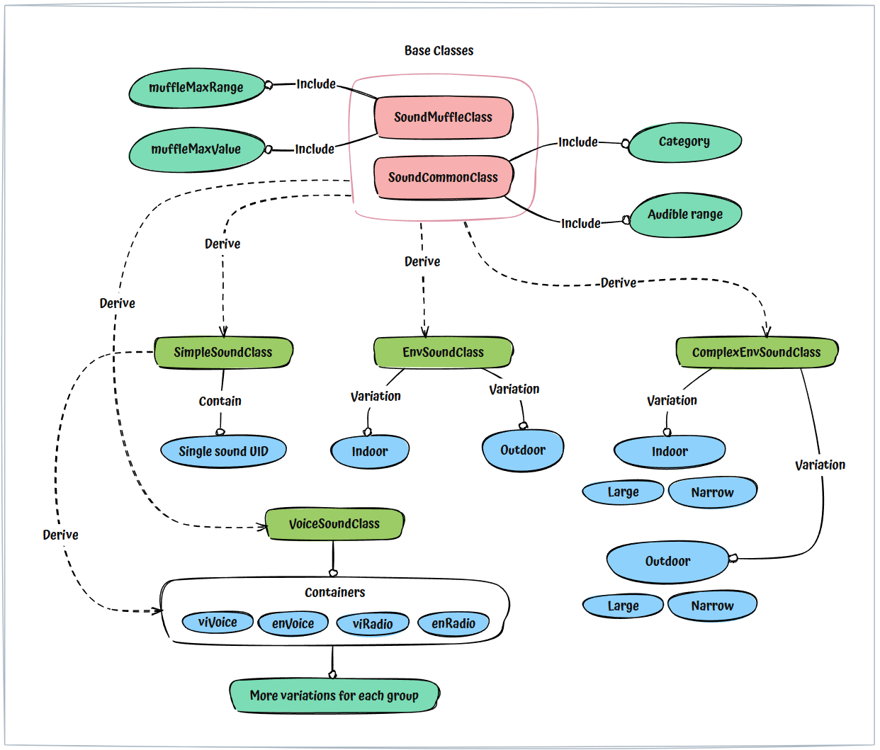 VoiceSoundClass: An intermediate class that aggregates multiple SimpleSoundClass containers. It is used to store various takes for each voice line, categorized into four groups: Vietnamese Vocal, Vietnamese Radio, English Vocal, and English Radio.