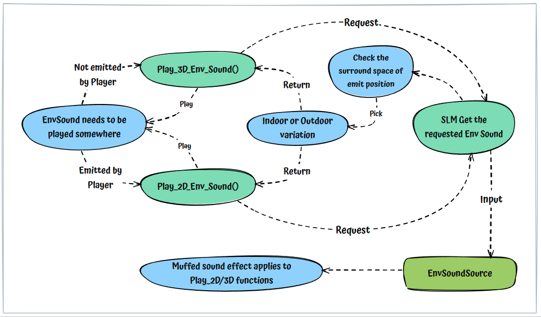 This sound element is designed for handling sound playback that adapts to its surrounding environment, offering distinct Indoor and Outdoor variations. Upon a sound request, the Sound system will assess the environmental space and then play the corresponding variation. Dynamic muffle effects can also be applied to this sound element.
