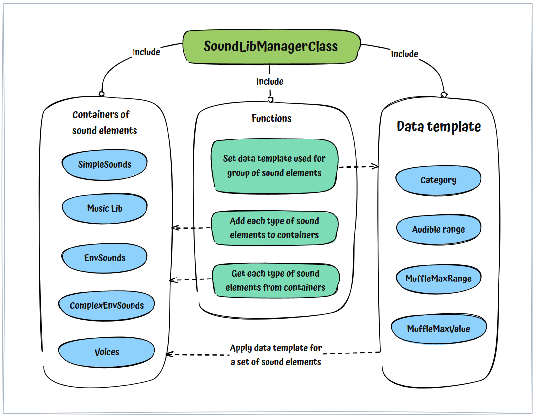 This class serves as the central manager for the entire sound system. Its responsibilities include integrating various sound elements, preparing and/or requesting sound resources from the Sound Library Manager, and managing character voice queues.
